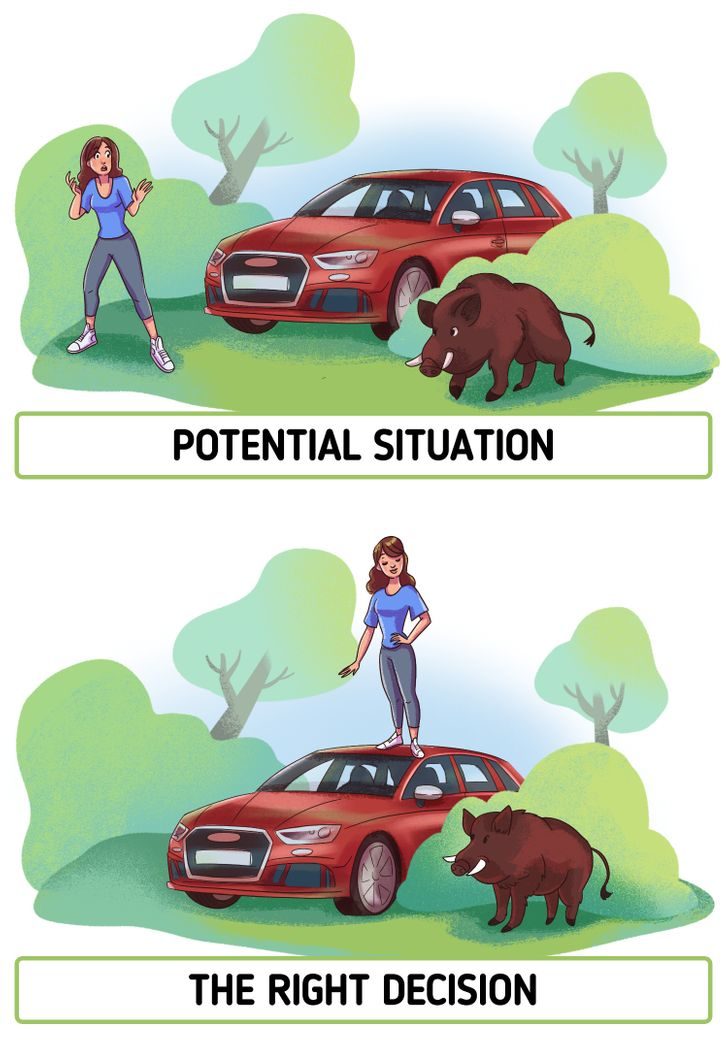 野猪很好斗,尤其是带小猪的母猪,如果你看到请马上掉头离开。此外,公猪在11月至1月的交配季节很危险。遇到生气的野猪是最坏的情况之一。如果遇到这种动物,请遵循以下简单规则: