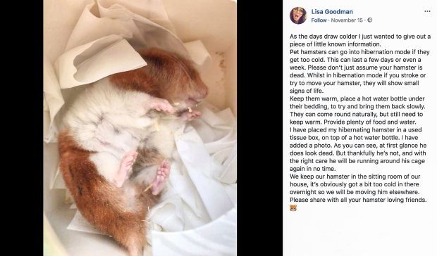 丽莎在脸书上想向网友告知这个讯息,因为很多人搞不好就因为这样把他们的仓鼠活埋了…丽莎说:“福吉是我女儿莉莉的仓鼠,我只是祈祷他会醒来。我不想告诉她他已经死了。福吉很冷,据我所知,仓鼠原本是来自温暖的气候,所以他们会有这种『假死状态』其实就是冬眠,我原本也不知道,是几年前我养的一只仓鼠也是这样突然活过来我才知道的。”