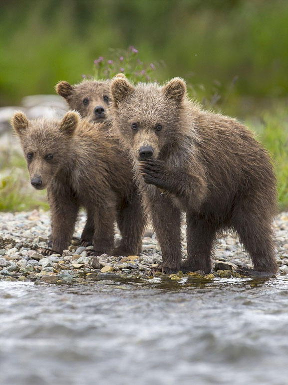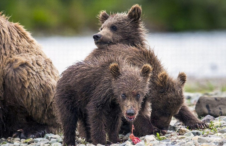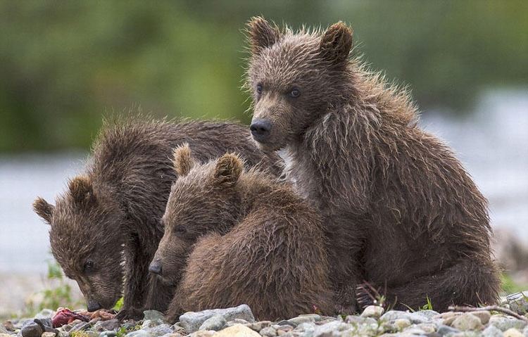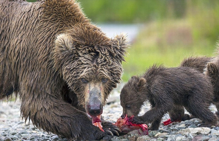 幼崽享受晚餐时,母熊则警惕地四下观望,谨防公熊出现威胁幼崽。