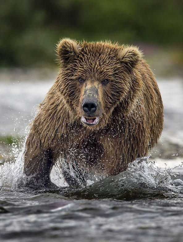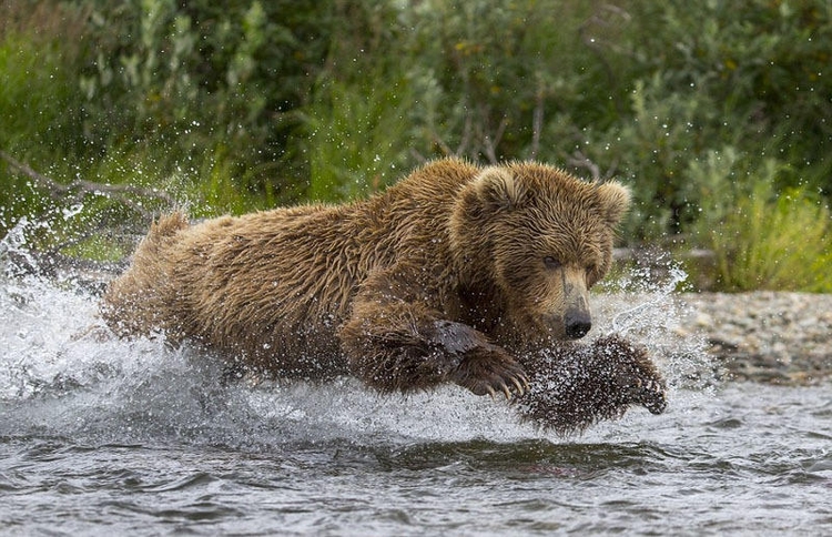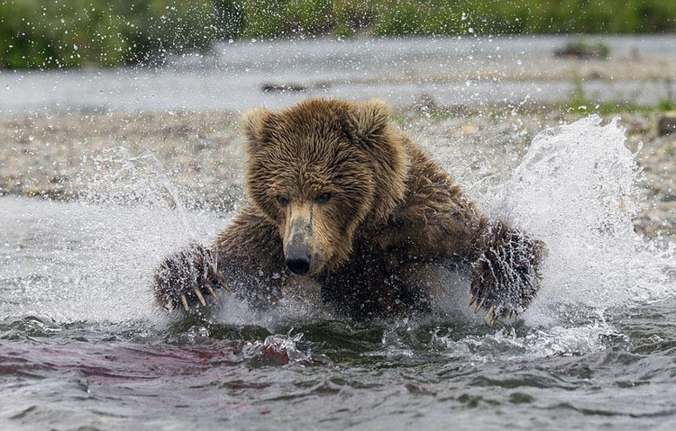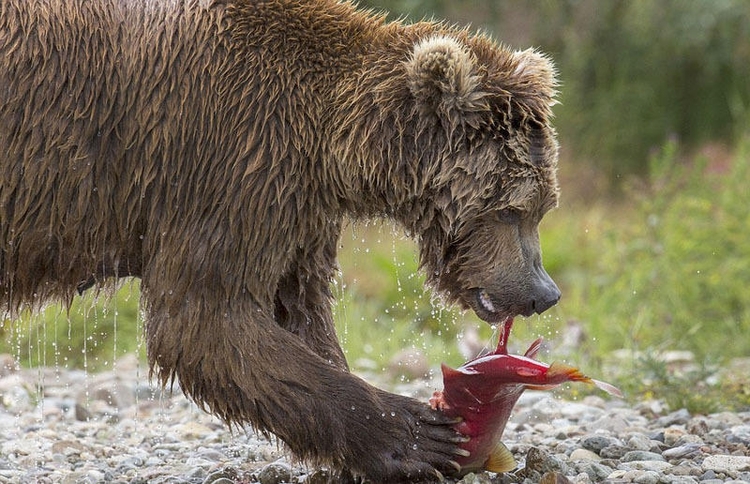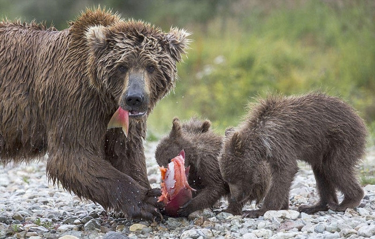 幼崽吃完后,母熊还会再次回到河里为幼崽捕获更多的鲑鱼。