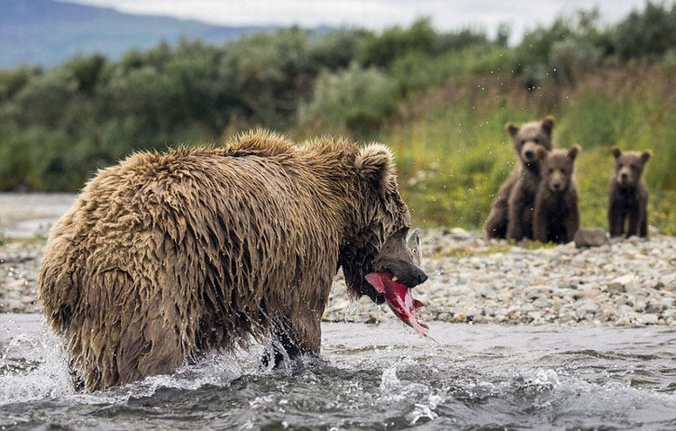 母熊抓到几条大鱼简单吃几口后,就返回河岸,把剩余的鲑鱼都给了饥饿的幼崽。