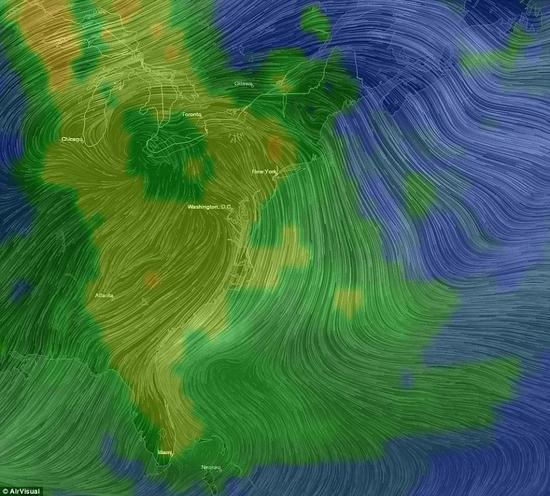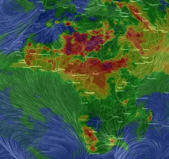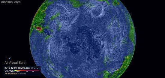 上图显示了大西洋周边地区的污染状况。白色线条代表气流运动和天气状况,红绿颜色则代表空气中PM2.5的浓度。