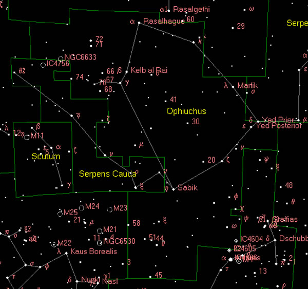 蛇夫座(拉丁文Ophiuchus,简写为Oph)(11月30日至12月17日)是赤道带星座之一,从地球看位于武仙座以南,天蝎座和人马座以北,银河的西侧。蛇夫座是星座中唯一一个与另一星座——巨蛇座交接在一起的,同时,蛇夫座也是唯一一个兼跨天球赤道,银道和黄道的星座。蛇夫座既大又宽,形状长方,天球赤道正好斜穿过这个长方形。尽管蛇夫座跨越的银河很短,但银河系中心方向就在离蛇夫座不远的人马座内。银河在这里有一块突出的部分,形成了银河最宽的一个区域。 另外,虽然黄道穿越蛇夫座,但蛇夫座却不属于黄道十二宫。每年约11月29日,太阳从蛇夫座穿越,直至12月17日进入人马座为止。黄道上没有节气点在天蝎座却有大雪节气点在蛇夫座。