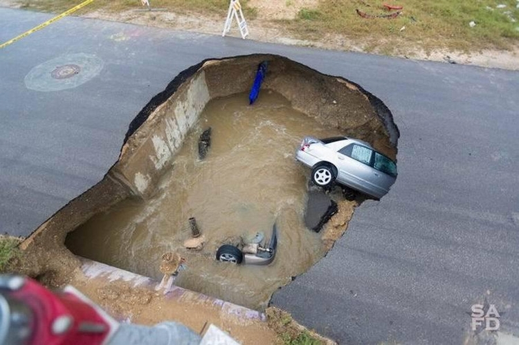 圣安东尼奥坑洞:2016年12月4日,美国德克萨斯州圣安东尼奥道路上出现一个巨大的坑洞,这是由于污水管道破裂,再加上强降雨,最终使道路地面下陷。这个巨大坑洞使两辆汽车陷入其中,导致一位警官下班途中身亡,两人受伤。