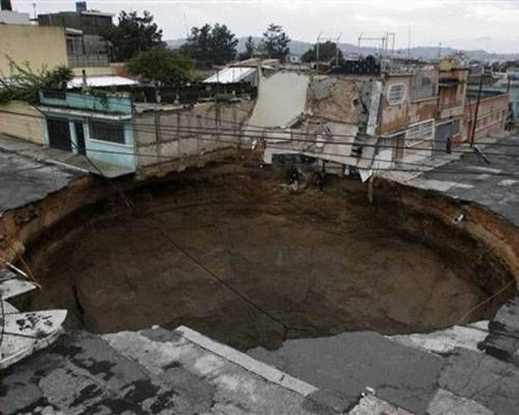 危地马拉坑洞:2010年6月,这个坑洞形成于危地马拉,下水管道爆裂可能形成这个地下空洞,其宽度为18米,深91米。