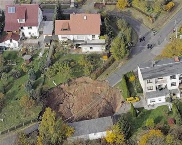 施马卡尔登坑洞:2010年11月1日,德国施马卡尔登地区居民街道上形成一个巨大的坑洞,使许多车辆陷入其中。