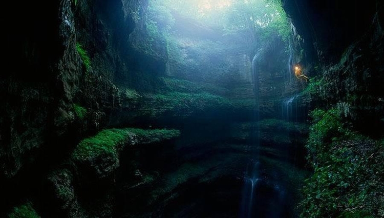 “永不沉没洞穴”:这是位于美国阿拉巴马州的一个石灰岩坑洞,由于这里有美丽的瀑布,洞壁覆盖着蕨类植物。这个洞穴顶部大约12.2米宽,但是底部宽度却达到30.5米。