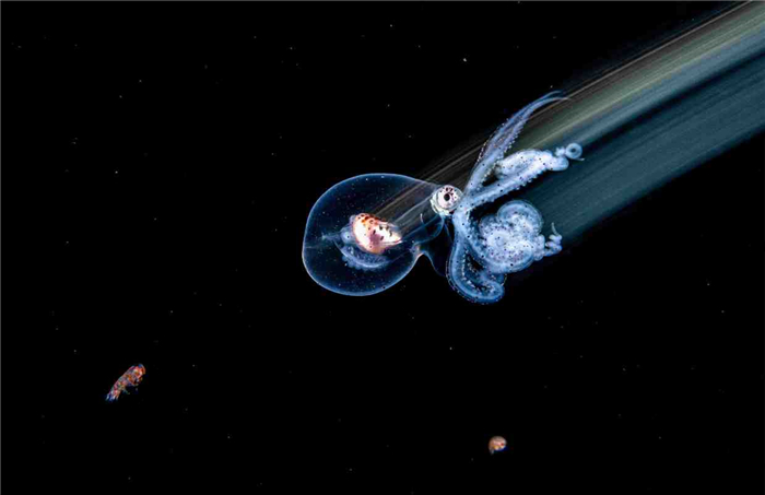 3. 晚上在菲律宾阿尼劳拍摄的八爪鱼章鱼,就像在黑暗的海洋深处游泳一样。亨利·斯皮尔斯 (Henley Spiers) 拍摄的这张作品,让他成功进入“年度探险摄影师”类别的照片。