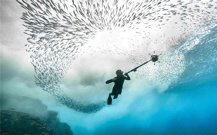 12. 这是在留尼旺群岛,摄影师用360环景相机拍下鱼群被浪卷起的画面。