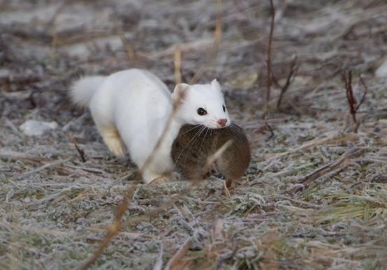 不过,伶鼬其实是名符其实的“吃货杀手”!虽然分布在欧洲、亚洲及北美洲北部等温带干燥地区的它们体型娇小,但它们有能力猎杀比自己体型大几十倍的动物,例如松鸡、雉鸡、大野兔等等。不过体型小小的它们,新陈代谢比类似大小的哺乳动物快两倍!伶鼬每天要吃掉超过自身体重三分之一的食物才能满足。所以它们几乎停不下捕猎,不停地吃、不停地吃,一只野生伶鼬一年可以吃掉3500只老鼠和田鼠呢。