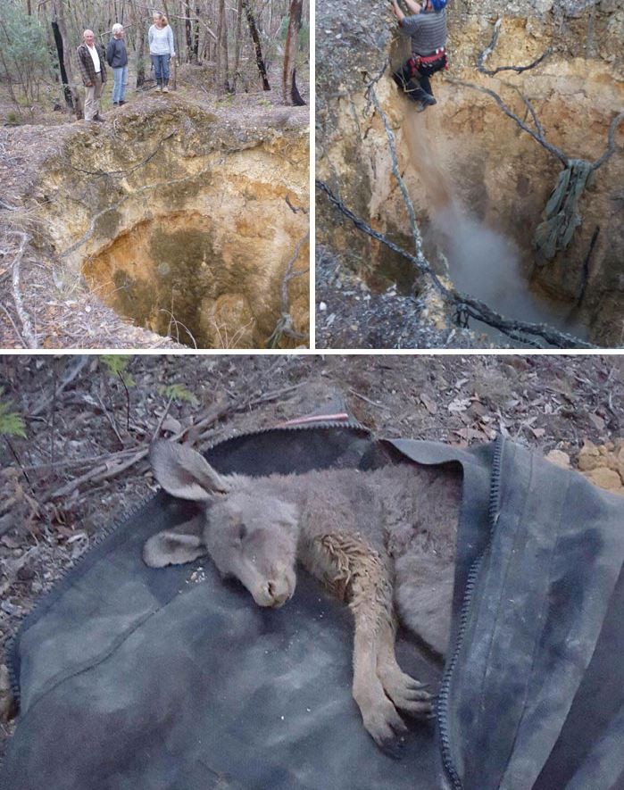 在澳洲一对夫妇发现一只袋鼠掉到矿坑中,因为洞穴实在太深了,只好请当地野生动物保护组织来救援。凹凸不平的岩壁加上太阳渐渐下山,解救的过程相当困难,最后还是顺利救出小袋鼠!住院一个晚上后,小袋鼠已经可以在病房里蹦蹦跳跳了!