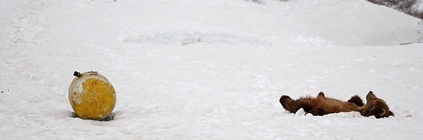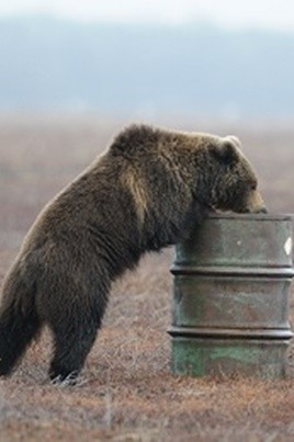 野生动物摄影师花了7个月追踪这些吃油熊,他发现棕熊不仅吸食着燃料桶,有时还会聚集在直升机或者降落的飞机附近闻闻香纯的燃油味,就像酒鬼总会酒吧里狂舔有威士忌残留的烟灰缸一样落魄。