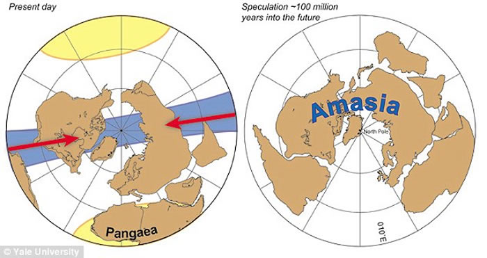 根据《每日邮报》报导,耶鲁大学(Yale University)与日本国立海洋开发机构(JAMSTEC)的科学家透过模拟,指出在2.5亿年以后,北美洲将会与南美洲完全连在一起,欧亚大陆也会与整个美洲相连,而加勒比海和北冰洋将消失,成为一块全新的超级大陆阿美西亚。这项研究结果刊登在《自然》(Nature)期刊上。