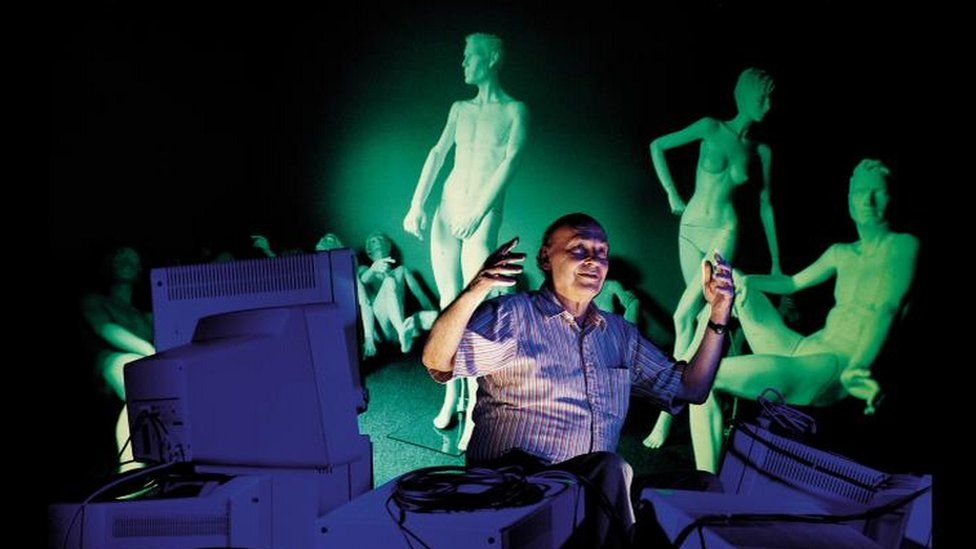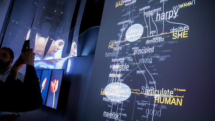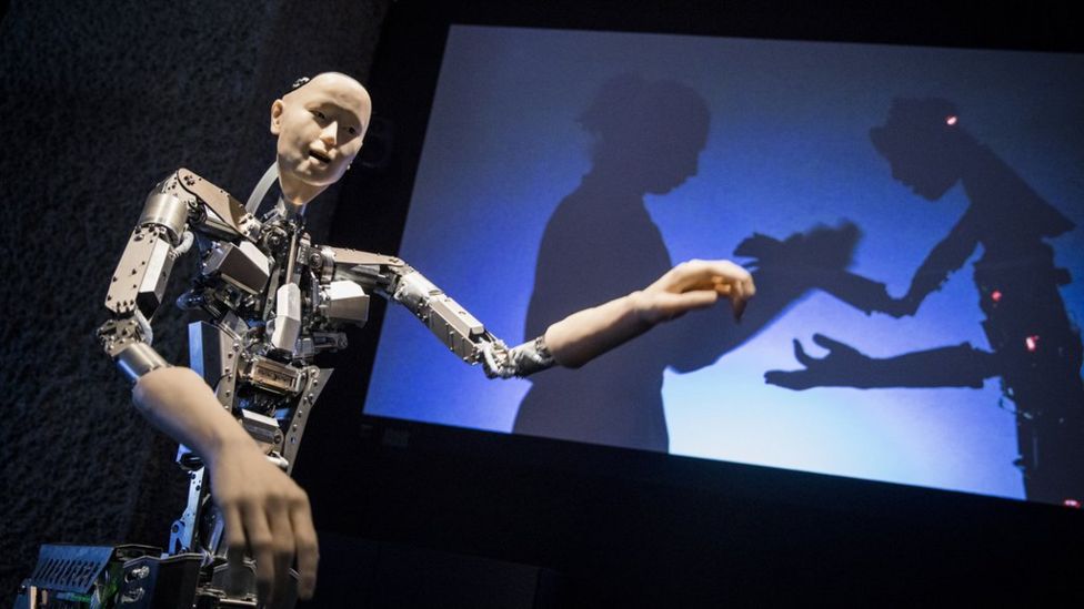 来自日本的拟人机器人Alter会学跳舞。图为伦敦巴比肯中心“AI:超越人类”展览上的Alter。