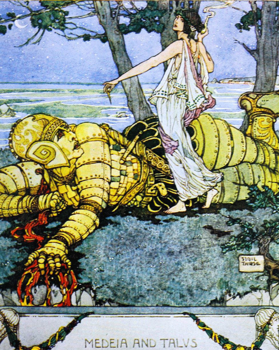 古希腊荷马史诗中的铜制机器人塔洛斯据信是世界上第一个拟人机器人。托马斯·布尔芬奇一本关于希腊神话中的神祗和英雄故事的书(1920)中塔洛斯的彩色插图,插图作者是西贝尔· 陶斯(Sybil Tawse)