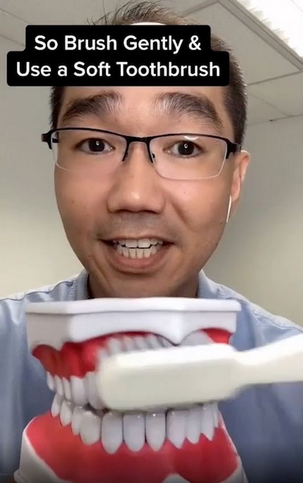 他建议大家温柔地刷牙,并且使用软毛牙刷。