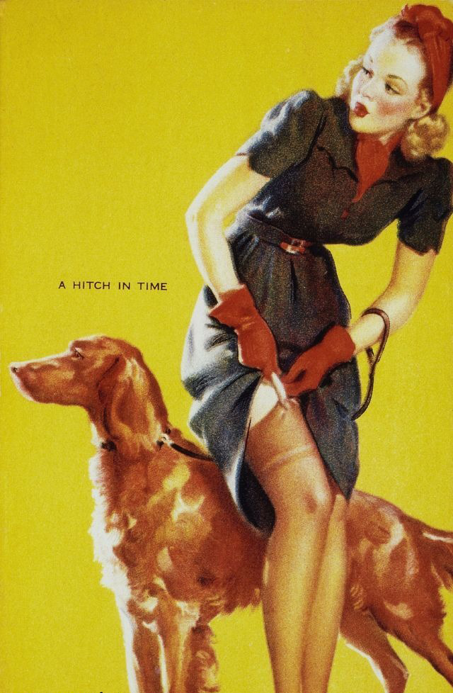 二战期间,丝袜短缺的现实未曾影响到人们对丝袜的渴望和欣赏。买不起丝袜的女性会用眉笔在腿上画出丝袜的竖线条纹来聊以应急,而身着丝袜和吊袜带的年轻女郎依然是男性的幻想对象。图为1940年以性感女郎为题材的海报,图中女子身着高筒丝袜、将小匕首藏在丝袜边上,丝袜勾勒出她腿部的完美线条,修饰肤色。