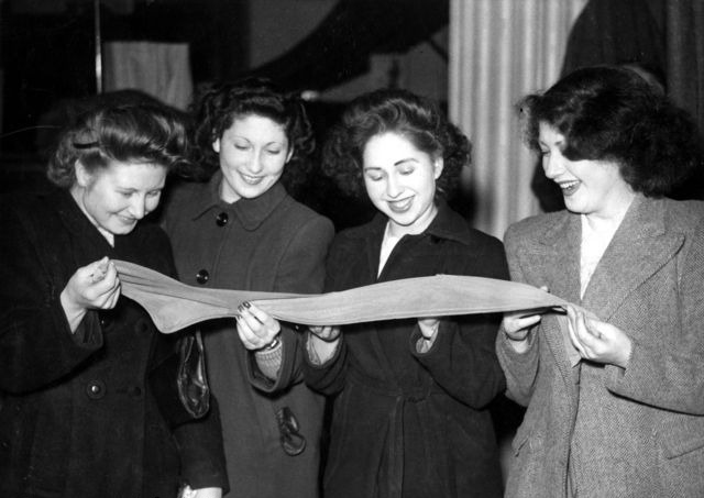 现代丝袜的问世和普及多亏了尼龙材质的发明。1935年2月,在美国杜邦公司(DuPont)任职的化学家华莱士·卡罗瑟斯(Wallace Carothers)指导同事以人工合成的方式来发明了尼龙,并由此将其改良为尼龙纤维,制作成妇女穿用的丝袜。1940年5月,历史上第一批尼龙丝袜在美国上市,引起轰动。图为妇女们在展销会上端详着这批由全新材料制成的丝袜,摄于1940年。