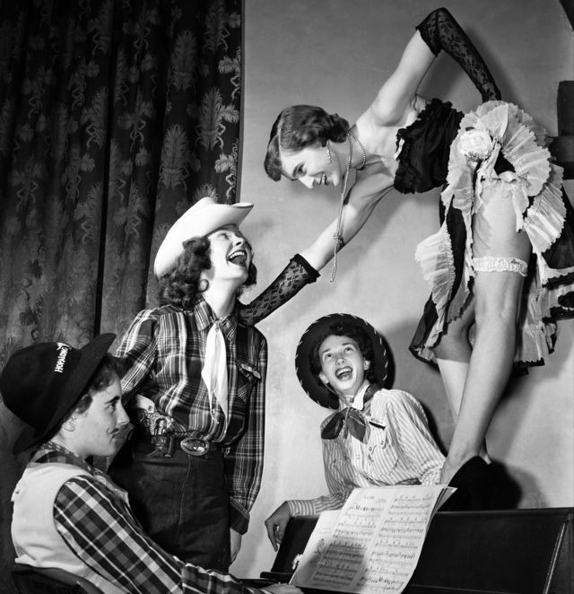 战后,随着尼龙材质解禁,工厂开始重新生产尼龙丝袜,丝袜再度成为最走俏的商品。同时,由于二战期间女权主义运动兴起,战后各国掀起了女性解放运动风潮,鼓励女性大胆展示自我,丝袜也由此增添了女权主义色彩,身着丝袜的女郎不再仅是满足男性幻想的“花瓶”,而是美丽的化身。图为上世纪五十年代美国德州一处舞厅里的舞女,她穿着绣有蕾丝花边的丝袜,大方展示出自己身体的线条美。