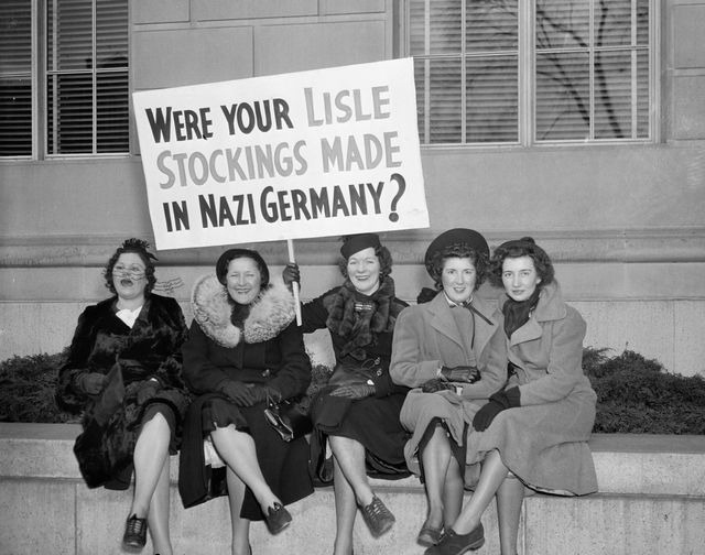 同时,尼龙丝袜的问世和走俏背后也带有一定的政治含义。二战爆发后,尼龙成为军需品,尼龙丝袜随之开始限量发售;同时,由于民众自发主张共赴国难、抵制来自轴心国的商品,女性开始抵制日本生产的生丝丝袜。图为珍珠港事件爆发后,美国费城的针织行业协会代表来到白宫举行示威游行,手持“你会穿用产自纳粹德国的丝袜么?”标语,鼓励女性宁愿不穿丝袜也不要穿用或购买日本生产的丝袜。
