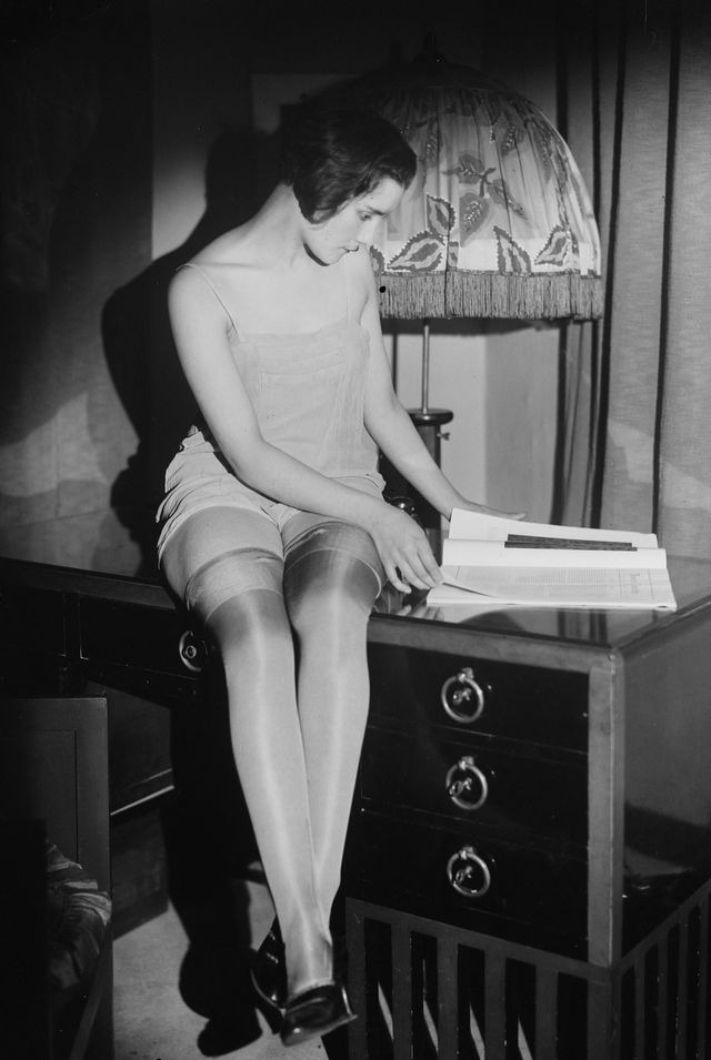 真正意义上的现代丝袜是在20世纪问世。随着织布技术的革新,羊毛、棉、真丝等材质得到更广泛的应用,而丝袜也随之从上流社会专享的高级手工制品变成了各个阶层的妇女都可以买到、用到的日常衣物。但其中最昂贵的依然是真丝材质丝袜,英语里的“丝袜”一词silk stockings里就包含有材质为丝绸(silk)的意思,同时也暗指穿上丝袜后女性双腿肌肤的触感像丝绸一样细腻光滑。图为上世纪20年代一位模特在展示丝袜的穿着效果。