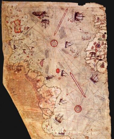5.伊斯坦布尔的托普卡帕宫图书馆里面有一张令人费解的地图,描绘了非洲西部、南美洲东海岸直到南极洲北部海岸的路线,地质证据表明,南极在那时候依然是冰封的状态,然而地图上却显示这里没有冰川覆盖。