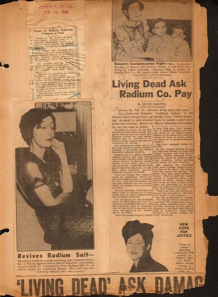 由于放射性化学品会发光,工厂请女工为手表的表面涂上镭。在长期接触这些颜料后,她们因为长期曝露在辐射环境下开始贫血、下巴肿胀、牙齿掉落、下颚更松脱坏死,最后全都患上癌症。