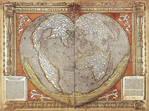 “欧文斯.非内世界地图”(Oronce Finé World Map)制于西元1534年,是古时的心型地图,其中展示了南极洲尚未被冰覆盖时的地貌。这张地图也绘制着某一块陆地,且是在它被正式“发现”之前…地图上还绘有陆地上的河川、峡谷、海岸线,也指出现今南极的近似位置。(来源)