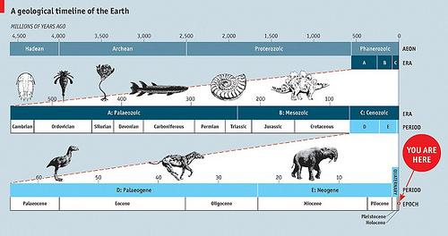根据人类世过往的论点,人类在1950年中断了1万1千7百年的全新世(Holocene)时代,当时核子试验在地表产生一个新地层。
