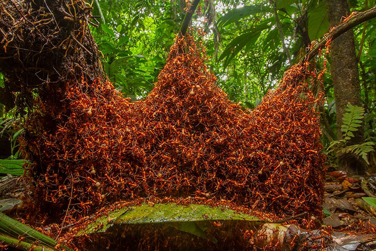 哥斯达黎加的这群蚂蚁不在地底或树上筑巢,他们用自己的身体筑巢,攀附在几根树枝之间,无树枝的蚂蚁组成一个巢穴,里面有许多通道和保护蚁后和养育幼蚁的房间。