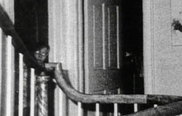 照片里还有一点使得这张照片有些惊悚,照片里有另外一张脸。如果你看灌木丛中的红色汽车,你会在它的上方看到有一张戴着黑色兜帽的白脸。