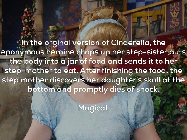 2. 原版的《灰姑娘》里,主角仙杜瑞拉分尸了她的继姊,还将尸块混进一罐食物里送去给继母吃。继母吃光食物后才在罐子底部发现女儿的头骨,当场吓到断气。这故事实在是很魔幻啊。