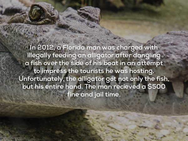 9. 2012年,佛罗里达州一名男子带一群游客坐船时,为让游客留下深刻印象,竟将一条鱼悬吊在船边表演喂食鳄鱼,还因此触犯非法喂食罪。更不幸的是,鳄鱼不只吃掉了鱼,还吃掉他整只手,他还得缴5百美元的罚金外加坐牢。