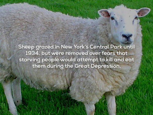 20. 一直到1934年以前,纽约中央公园都是有绵羊的。之所以移走它们,是因为当时正逢大萧条时期,怕有饿坏的民众吃了它们。