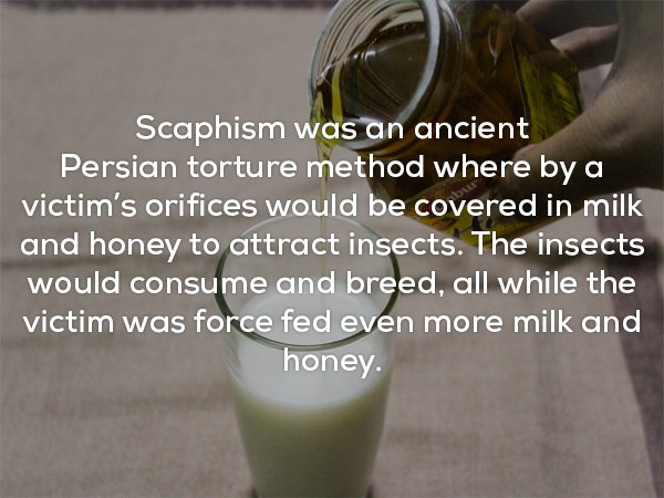 23. 船刑是古波斯人的凌虐手法,他们会在受害者身上的洞孔填满牛奶及蜂蜜来吸引昆虫来食用并繁殖,同时受害者会被强制灌食更多牛奶和蜂蜜。