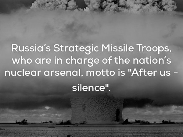 24. 俄罗斯战略火箭军负责掌管俄罗斯的核武军备,他们的座右铭是“在我们之后是一片寂静”。