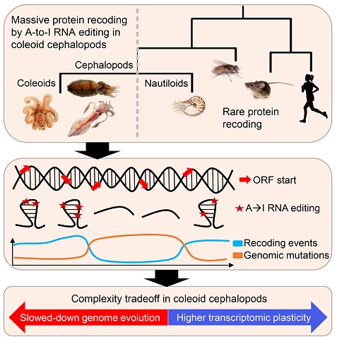 在2015年,研究人员发现普通鱿鱼在神经系统编辑超过60%的RNA。这些编辑在本质上改变了脑部的生理机能,大概是要适应海洋的各种温度条件。