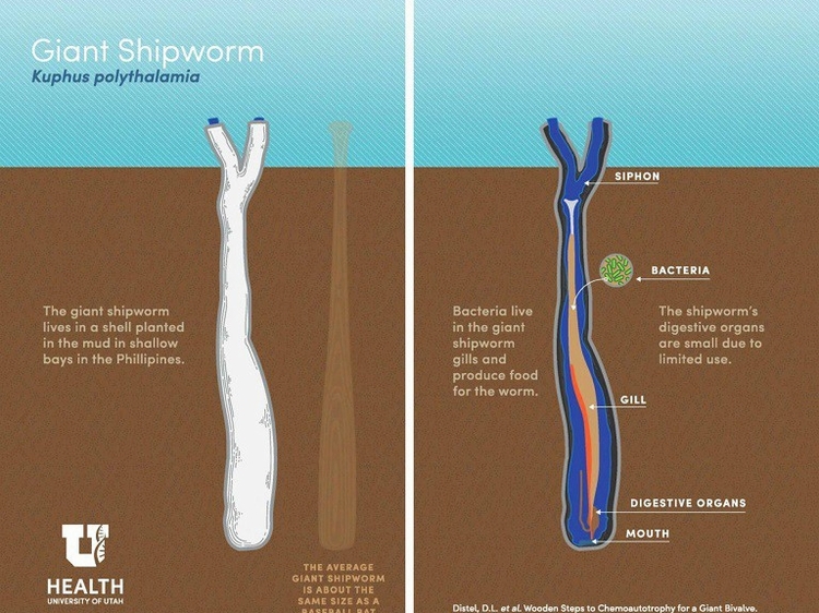 不像其他种类的蛀船虫,它藏身在水中的木材,并最终将木材消化,巨型蛀船虫生活在被它称为家的泥浆所生产出的硫化氢气体中。