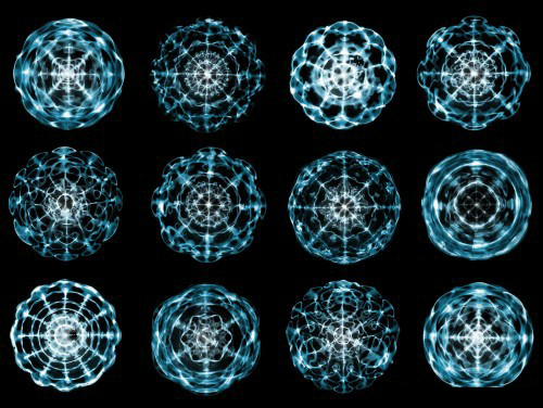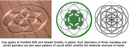 几何、声音、共振和振动是我们所谓物质世界的基础。例如,当原始的印度教发音“嗡/唵”(现代发语词“哼”的由来)透过音高镜(一个将人类声音转换成可见形式的装置)时,会形成五芒星、六角形,甚至复杂的曼陀罗…等等几何形状。