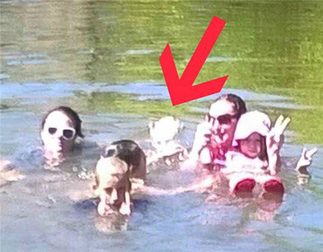 照片中这群人是在河边戏水的一家人,他们看到照片简直吓傻,很确定并不认识照片中那位半浮出水面的女孩 (还是男的?不确定),拍照者也很确信当时附近没有其他人…