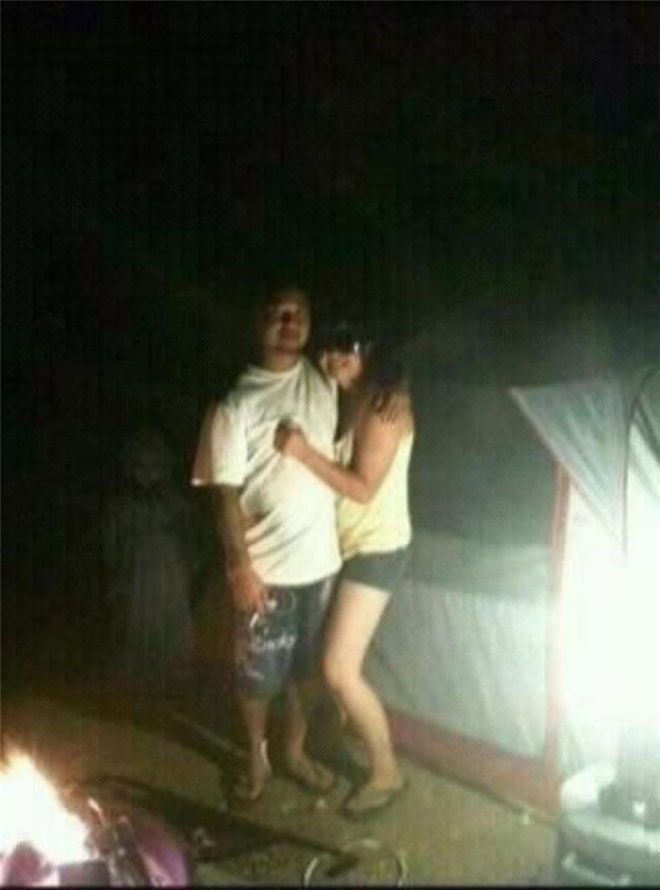 看起来像在野外露营的一对情侣,左边暗处居然浮现一个女孩的身影!穿着看起来也不像这个时代会有的风格…