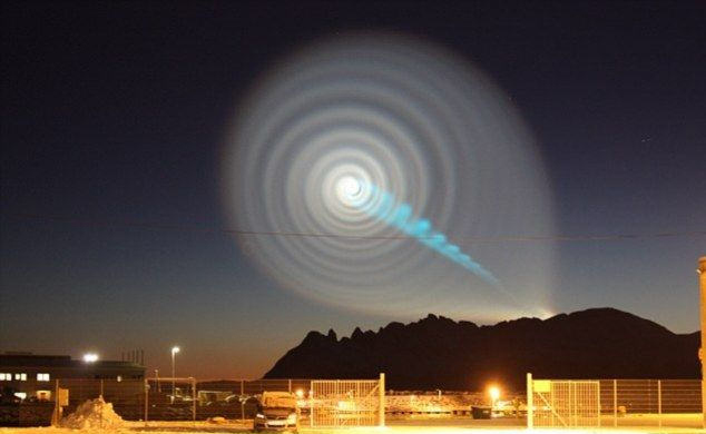“在2009年12月,挪威出现了惊人的螺旋灯,这是由于俄罗斯飞弹测试失败造成的。”
