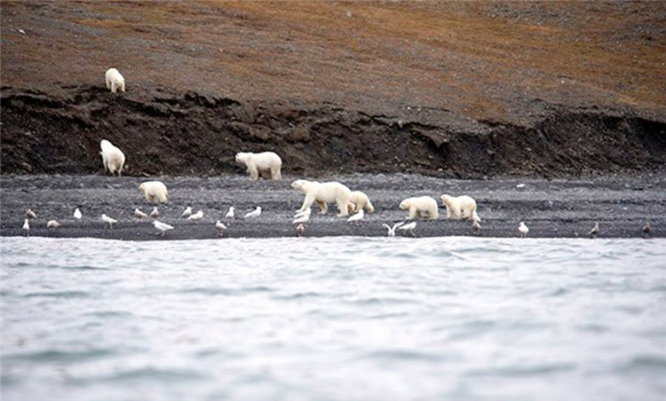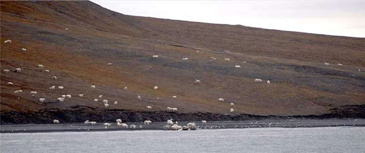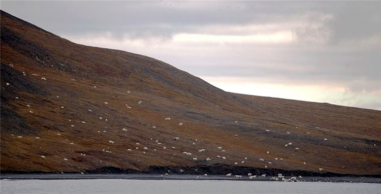 一向有各自领地的北极熊,为什么会这样地扎堆生活呢?当时导游被游客问到时,一开始也不知道原因是什么,直到邮轮离岸边比较近时,他才发现了原因。