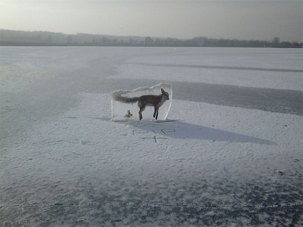 7. 这只被水淹死,结冰的狐狸被拿出来警告大家不要走在湖上…