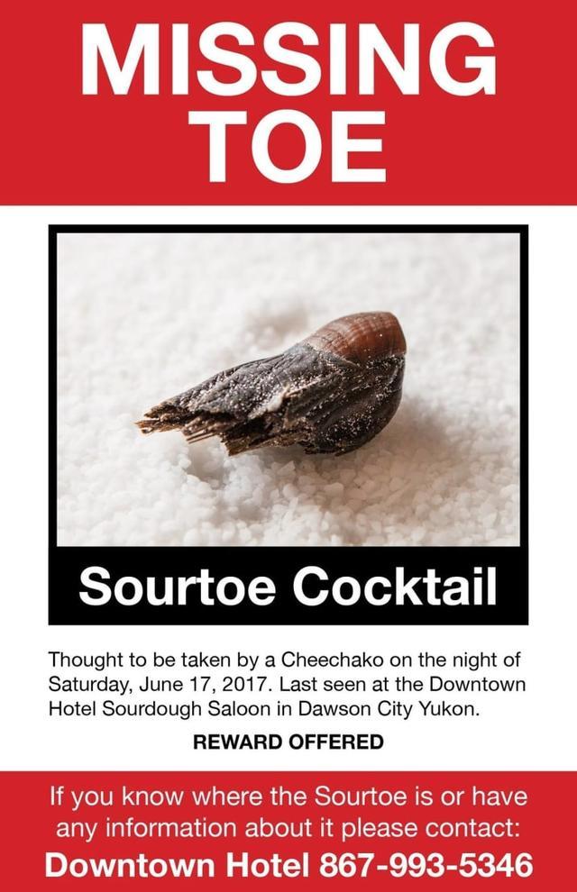 据悉,1920年,一位男子在前往阿拉斯加边界的路上,因冻疮断了一截脚趾;1973年,一位邮轮船长因缘际会下,捡到了这截脚趾,突发奇想把它泡在威士忌里称:“只要敢喝下这杯酒,让脚趾碰到嘴唇的人,就能得到奖赏。”