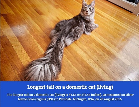 名叫“天鹅座”的这只2岁缅因猫,住在美国密西根州南菲尔德,乍看之下,除了拥有满身美丽毛皮之外,它就是一只普通猫咪,不过当它一转身,就会发现它的过人“长处”,一条超级无敌长到天边的尾巴,足足有17.58英寸(约等于44.66厘米),获得《吉尼斯世界纪录》认证,是世界上尾巴最长的猫咪!