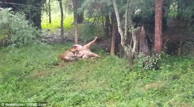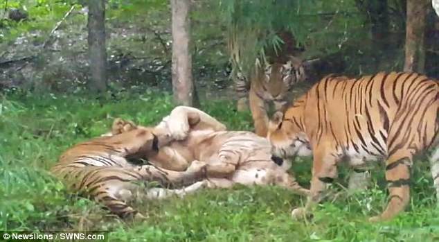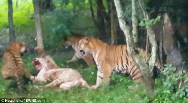 但这些孟加拉虎看到白老虎过来时并不友善,开始用爪子跟咬的方式攻击他们。