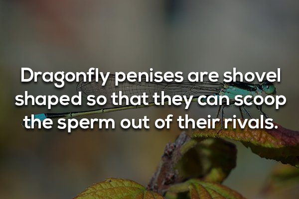 16. 蜻蜓的生殖器是铲子形的,这样一来便能铲出竞争对手的精子。