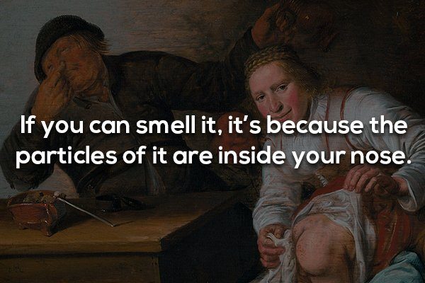 13. 如果你能闻到某样东西的味道,表示它的微粒被吸进你鼻孔里了。