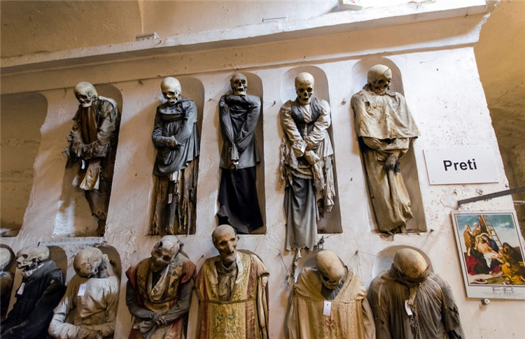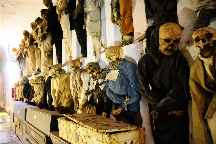 2. 意大利巴勒摩,卡普奇尼地下墓穴。这地下墓穴充满了8000位18、19世纪的人们的骸骨,不过这个墓穴礼拜天是不开放的,而且参观时小心别迷路,曾经有位醉汉在墓穴迷路,半夜醒来后被人发现他精神异常,就被送到精神病院去了。
